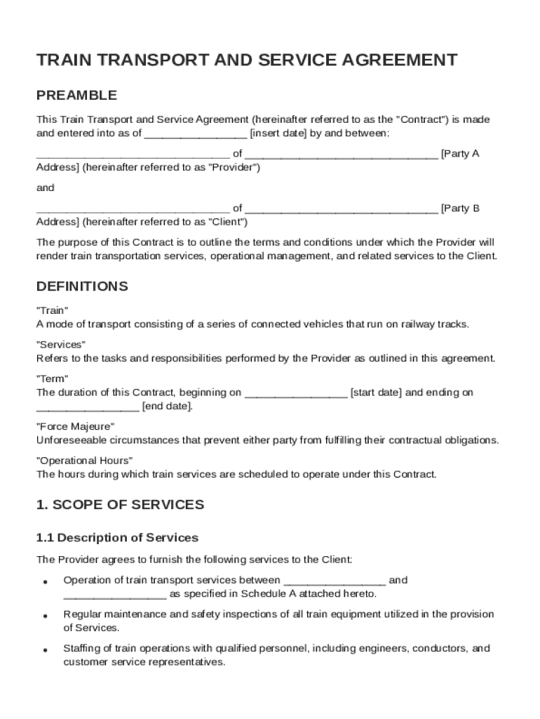 This document outlines the terms and conditions of a contractual agreement for train transportation services between a Provider and a Client, including definitions, scope of services, payment structures,