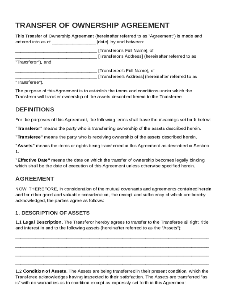 A Transfer Of Ownership Contract Template is a legal document that formalizes the transfer of ownership of an asset from one party to another.