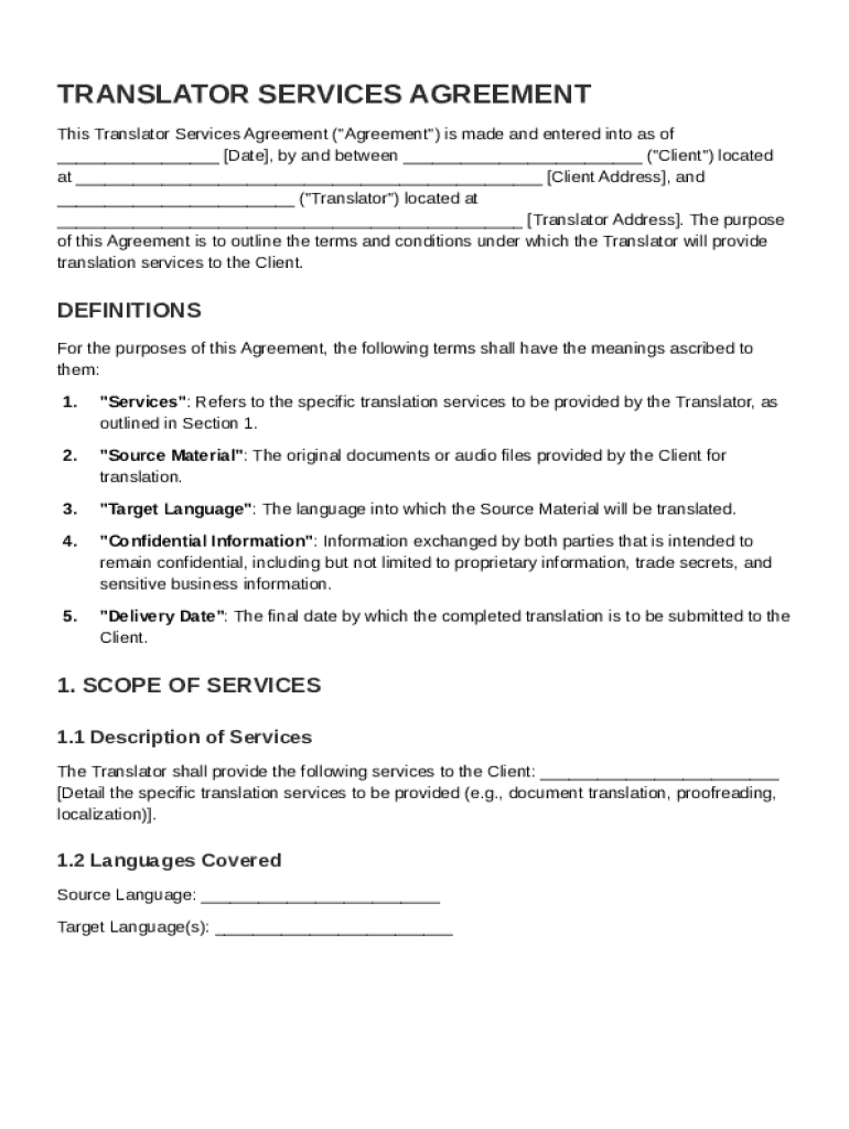 This document outlines the terms and conditions under which the Translator will provide translation services to the Client, including definitions, scope of services, compensation, confidentiality,
