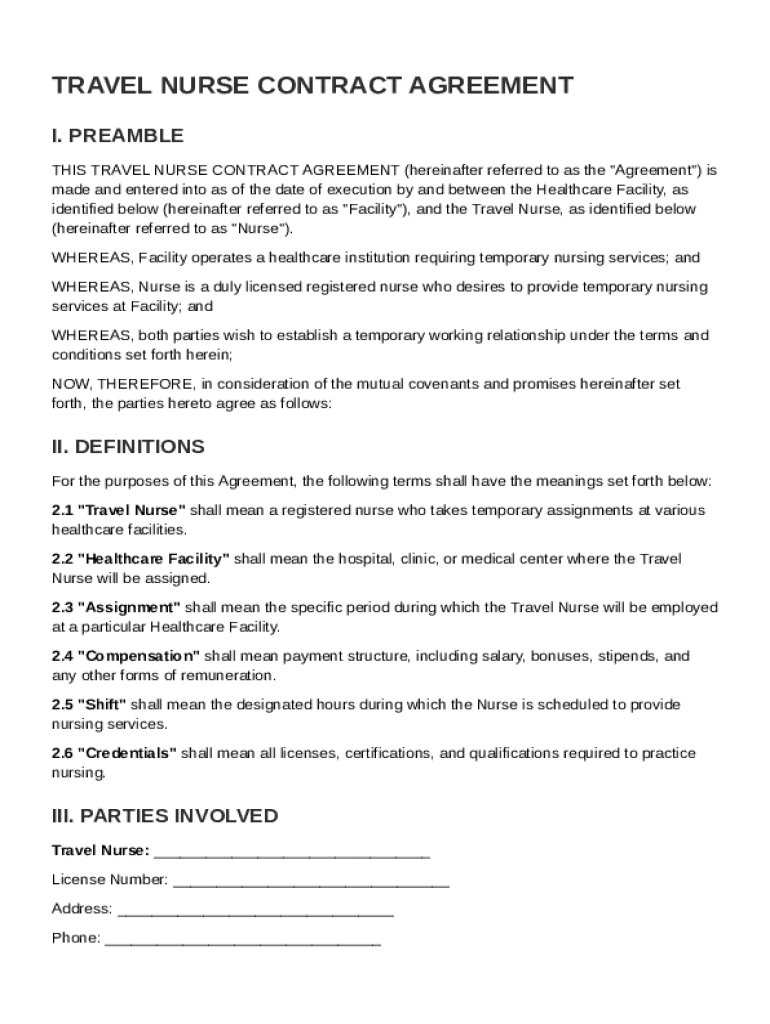 This document outlines the terms and conditions for a travel nurse\'s temporary assignment at a healthcare facility, including definitions, parties involved, assignment details, compensation, duties,