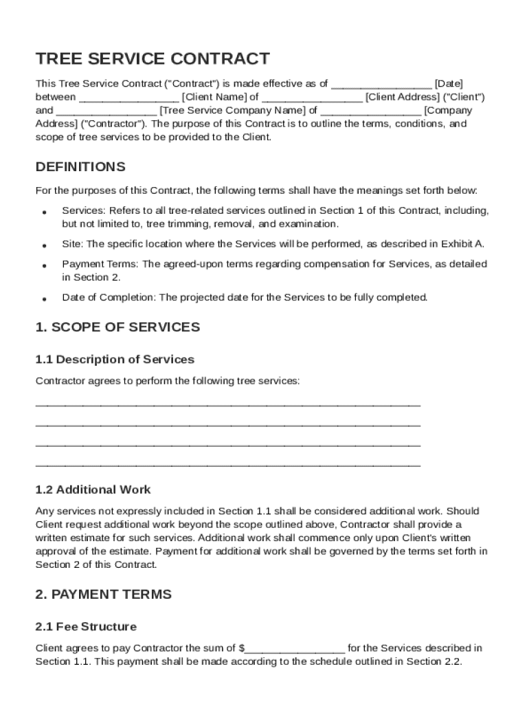 A Tree Service Contract Template is a formal agreement outlining the terms and conditions for hiring a tree service provider.