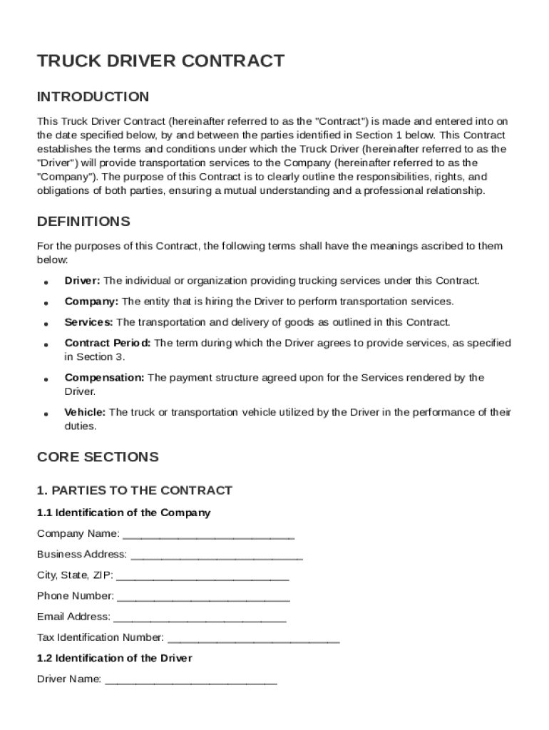 A truck driver contract is a formal agreement between a trucking company and a driver outlining the terms of employment and service expectations. This document is crucial as it protects the rights of both parties and clarifies responsibilities, ultimately helping to prevent disputes and misunderstandings.