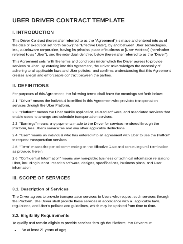 The Uber Driver Contract serves as a formal agreement between Uber and the Driver, clarifying roles, responsibilities, and expectations. It protects both parties legally and ensures compliance with relevant regulations.