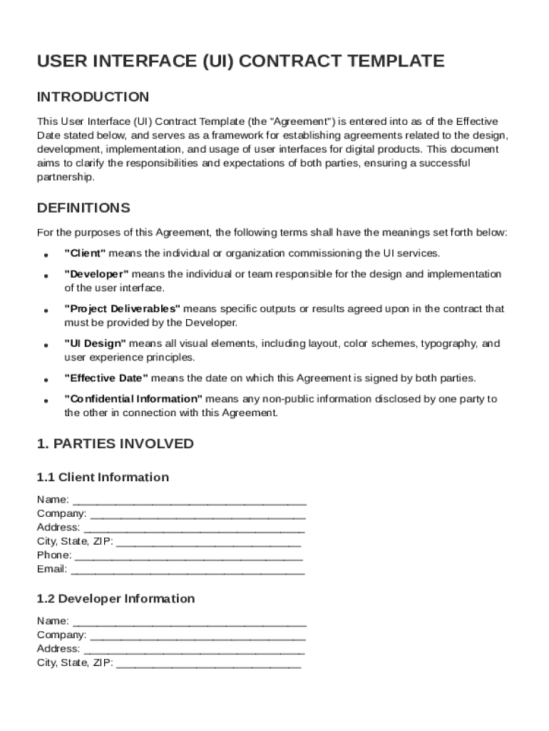 A Ui Contract Template is essential for outlining the terms and conditions between a developer and client involved in user interface (UI) projects. This document clearly defines the scope of work, timelines, deliverables, and legal obligations, thereby mitigating risks related to misunderstandings. Having a well-structured contract ensures that both parties are on the same page and can help prevent disputes.