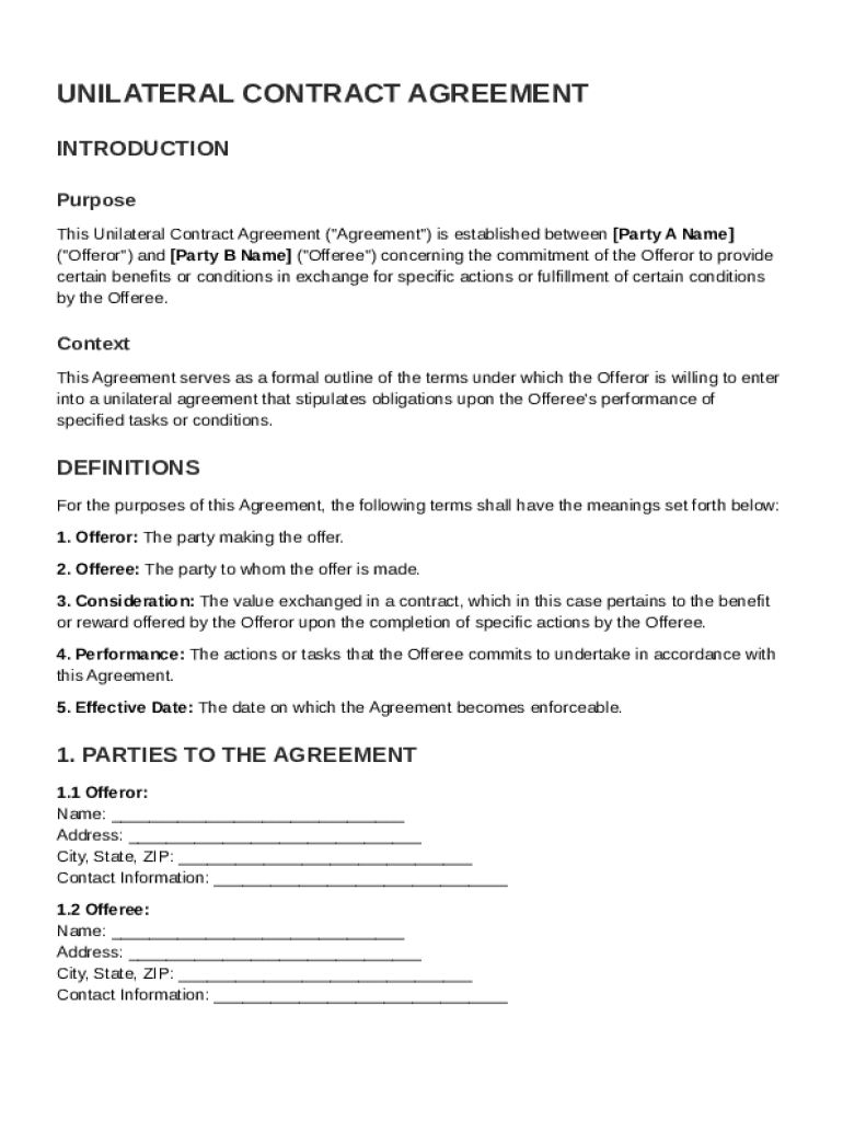 Understanding the components of a unilateral contract is essential for drafting a clear and effective agreement. A well-structured contract includes purpose, definitions, and identification of the parties involved. Each section plays a critical role in setting expectations and outlining obligations.