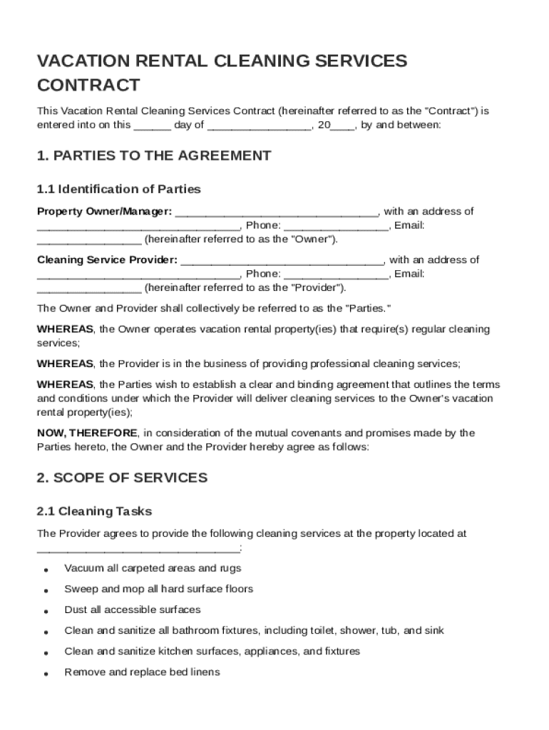 This contract establishes the terms and conditions between a property owner/manager and a cleaning service provider for regular cleaning services for vacation rental properties.