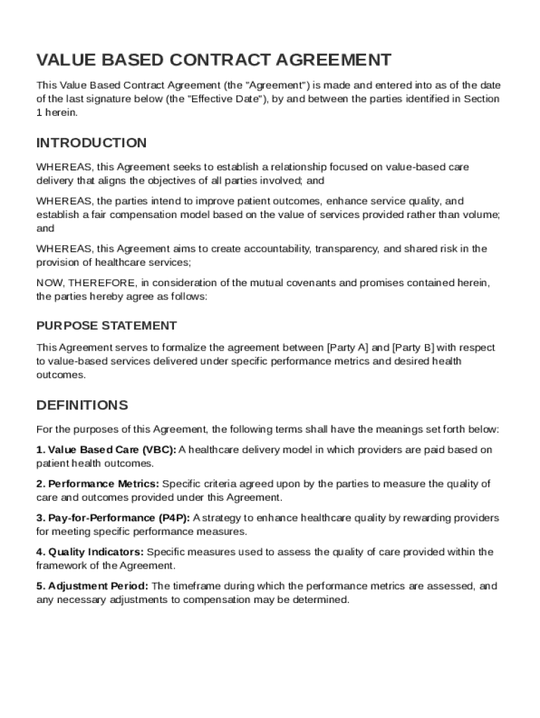This document establishes a Value Based Contract Agreement between parties aiming to improve patient outcomes and enhance service quality based on value rather than volume.