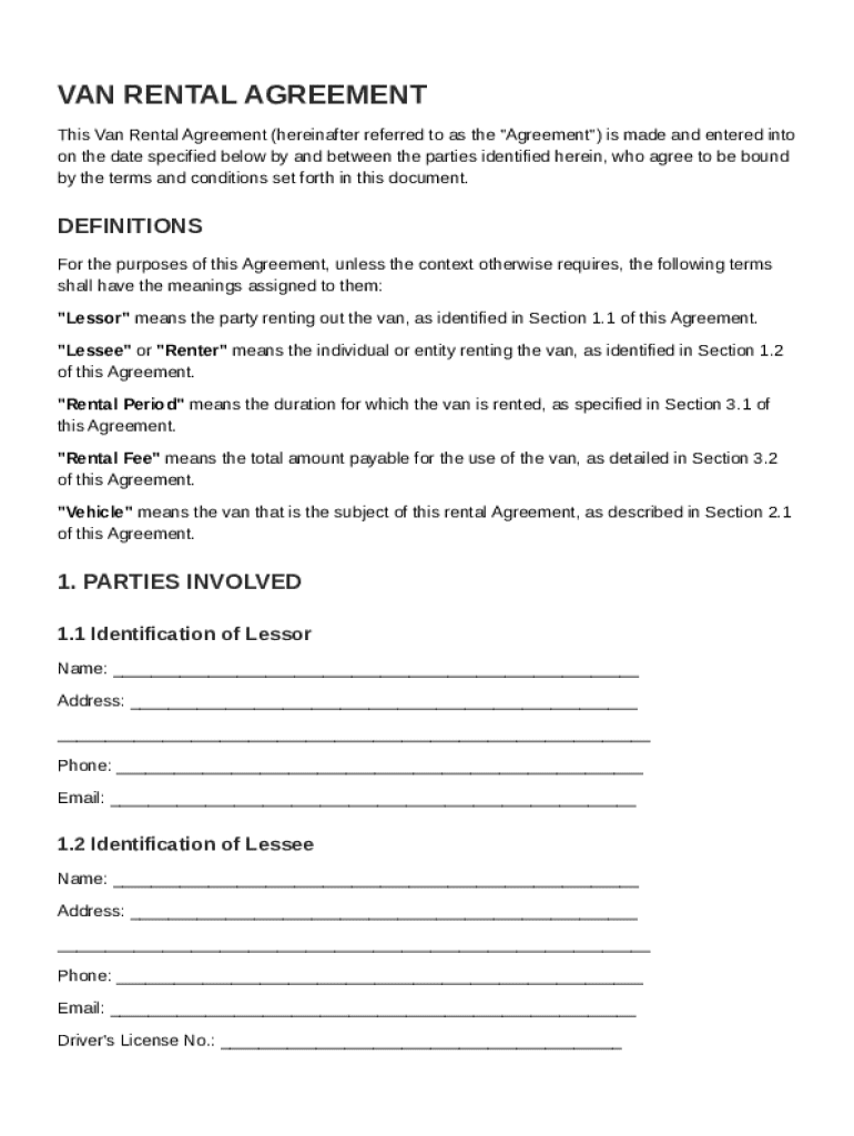 This document outlines the terms and conditions for renting a van, including parties involved, vehicle details, rental terms, insurance and liability, and other relevant provisions.