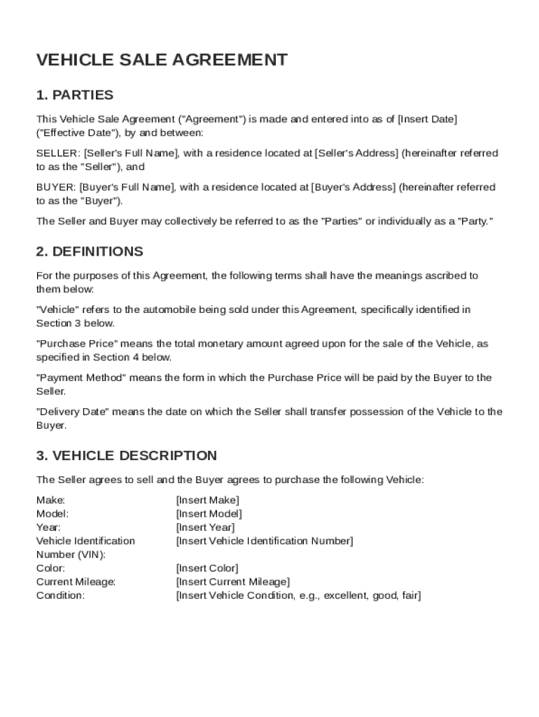 Providing a detailed description of the vehicle helps ensure clarity and precision in the contract. Essential details include the make, model, year, Vehicle Identification Number (VIN), current mileage, and condition, allowing the buyer to make an informed decision.
