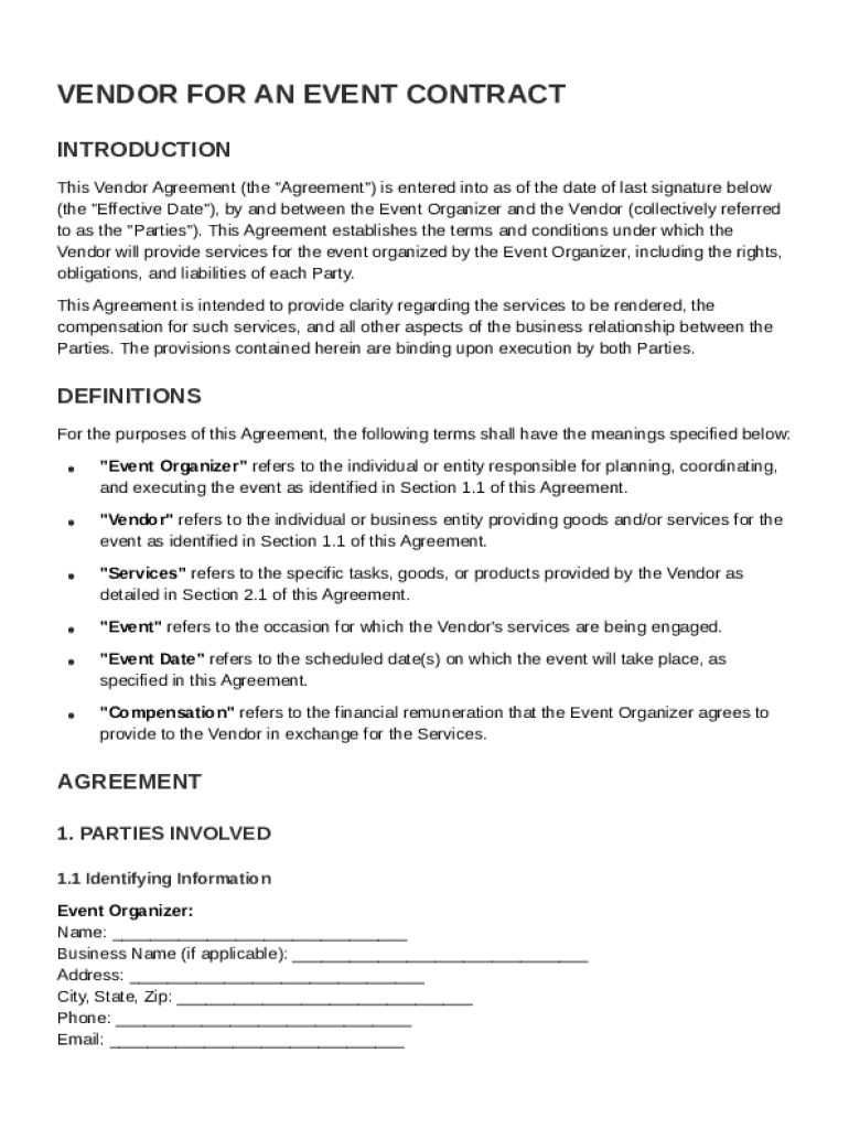 Identifying the key parties in a vendor contract is essential. Generally, these include the event organizer and the vendor providing services or goods for the event.