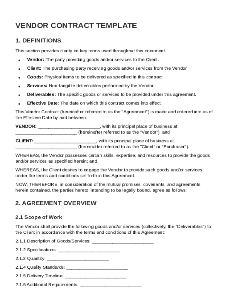 This document is a template for a vendor contract, outlining the terms and conditions between the Vendor and the Client, including definitions, scope of work, payment terms, responsibilities, confidentiality,