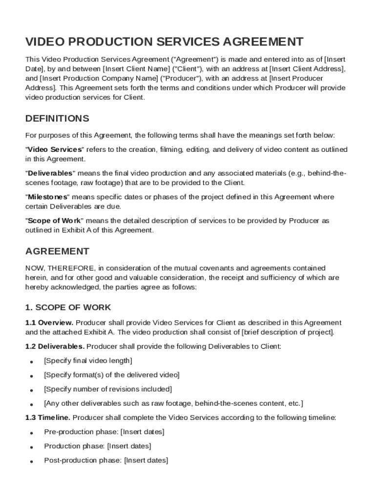 Key terms like Video Services, Deliverables, Milestones, and Scope of Work should be clearly defined to avoid ambiguity.