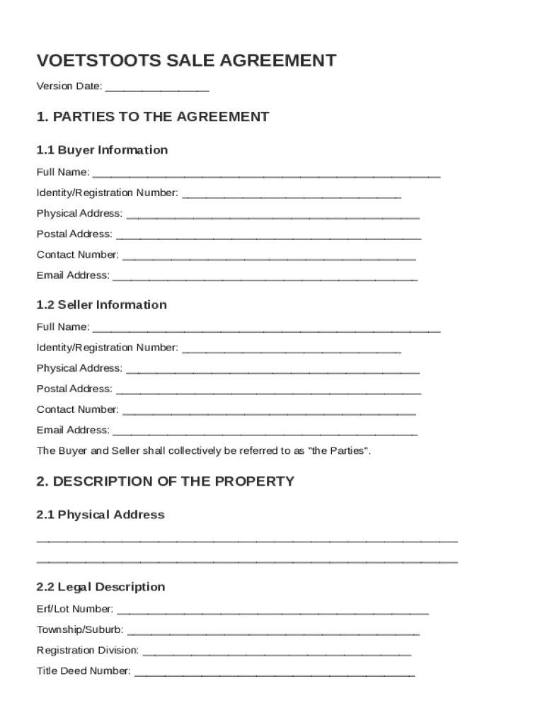 A comprehensive Voetstoots Sale Agreement includes several critical components. Here’s what you need to know:
