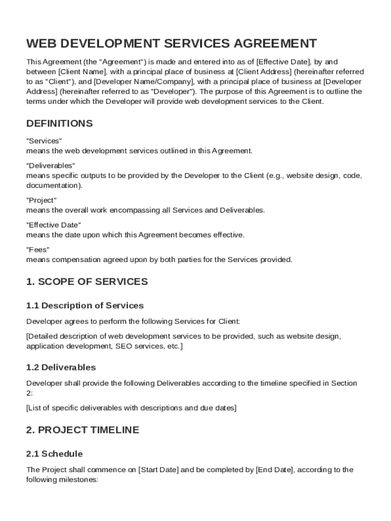This Agreement outlines the terms under which the Developer provides web development services to the Client, including definitions, scope of services, payment terms, confidentiality, termination,