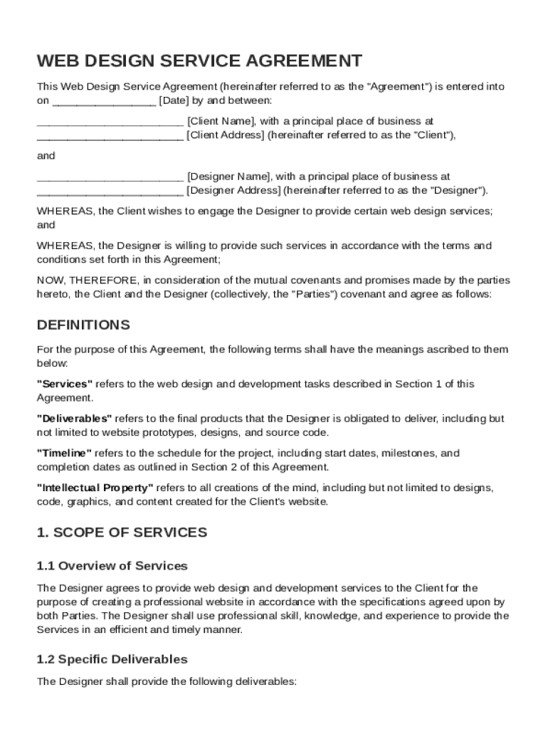 A comprehensive web design service agreement should encompass several key elements to ensure its effectiveness and utility.
