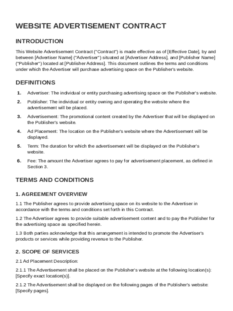 A Website Advertis Contract Template is a legal document outlining the terms and conditions for advertising services on a website.