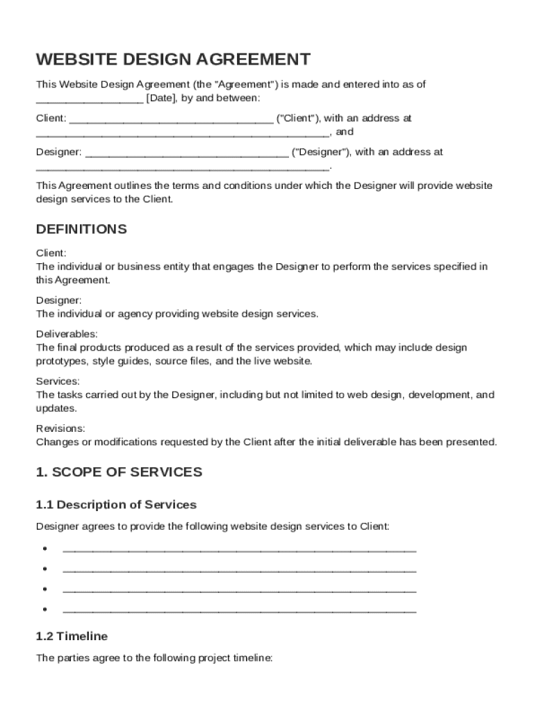 This document outlines the terms and conditions under which the Designer will provide website design services to the Client, including details on services, compensation, responsibilities, ownership