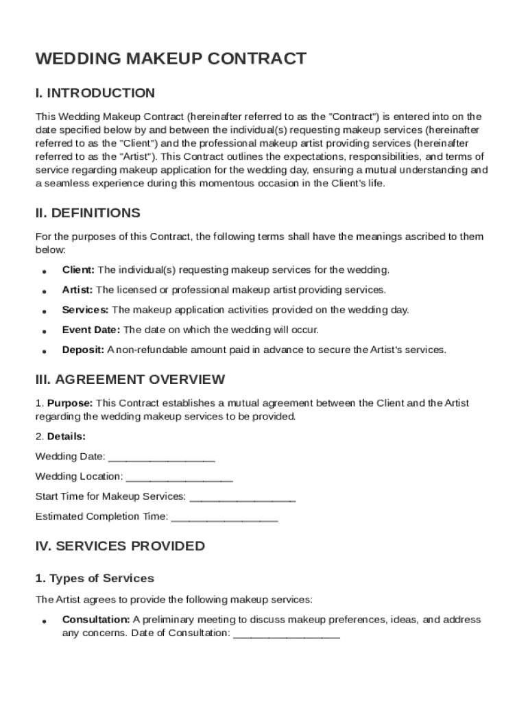 A Wedding Makeup Contract is crucial for establishing transparent expectations between the Client and the Artist. It serves as a legal document, offering protection against misunderstandings and disputes. By clearly defining the services, terms, and responsibilities, both parties can enjoy a smoother experience on the wedding day.