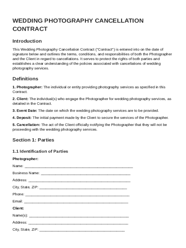 This contract outlines the terms, conditions, and responsibilities of both parties regarding cancellations of wedding photography services.