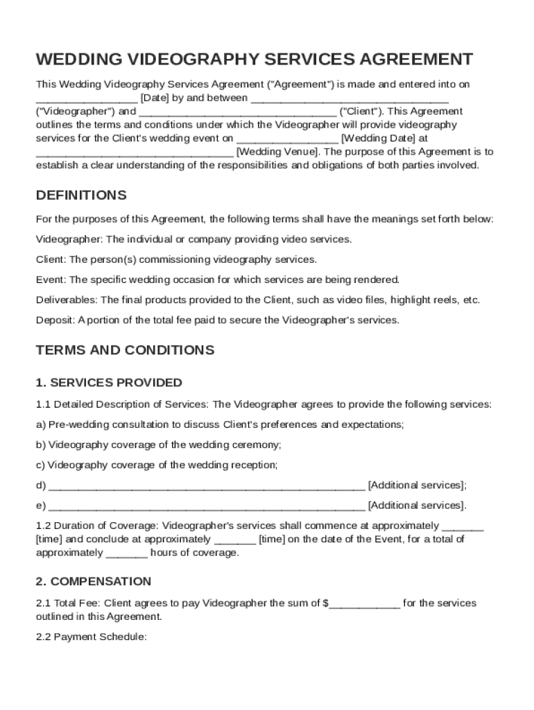 This Agreement outlines the terms and conditions under which a Videographer will provide videography services for a wedding event, detailing responsibilities, compensation, rights, and liabilities.