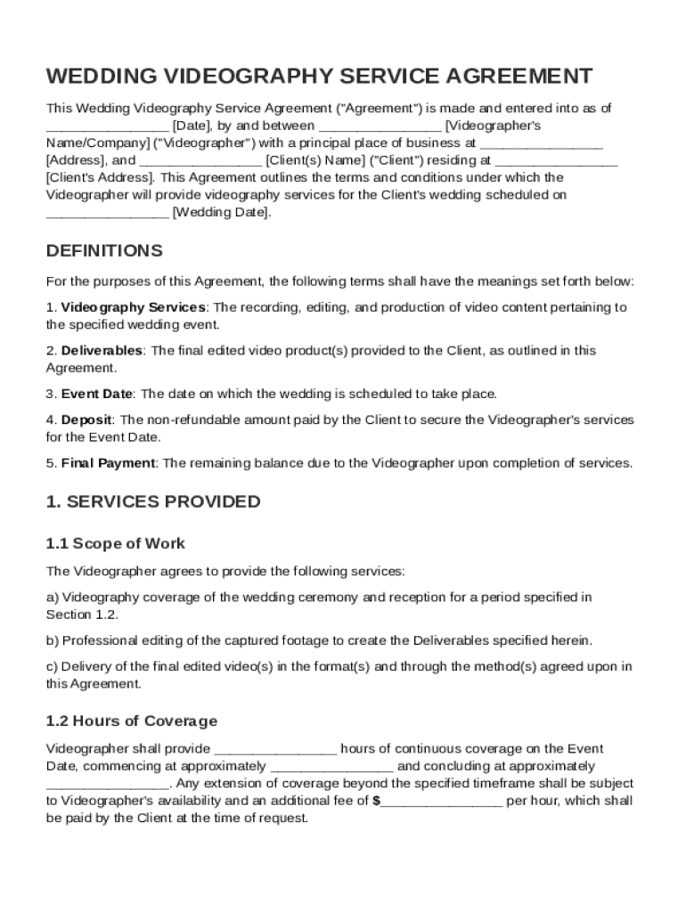 A wedding videography service agreement is crucial as it establishes a clear understanding between the videographer and the client. It defines essential terms like 'Videography Services', 'Deliverables', and 'Event Date', ensuring both parties know their rights and responsibilities. Typically, a comprehensive contract facilitates smoother transactions, prevents misunderstandings, and serves as a legal shield when necessary.
