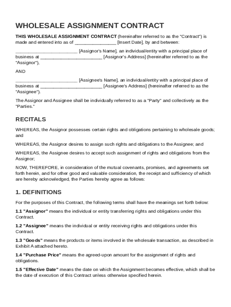 This contract outlines the terms and conditions for assigning wholesale goods and associated rights and obligations between an Assignor and an Assignee.