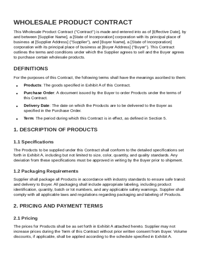 A wholesale product contract is a legally binding agreement between a supplier and a buyer that outlines the terms of sale for wholesale products. Its primary purpose is to ensure clarity around the obligations and rights of both parties, ultimately fostering a successful business relationship.