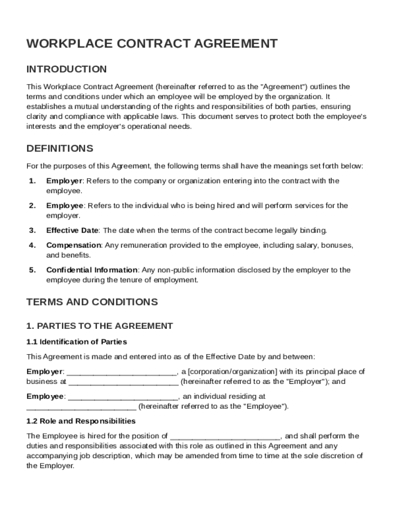 A workplace contract template is a pre-designed document that outlines the terms and conditions of employment between an employer and an employee. It serves as a formal agreement detailing mutual rights, roles, and responsibilities, facilitating clear communication. Ensuring that these documents are well-structured and comprehensive protects both parties and aligns their expectations.