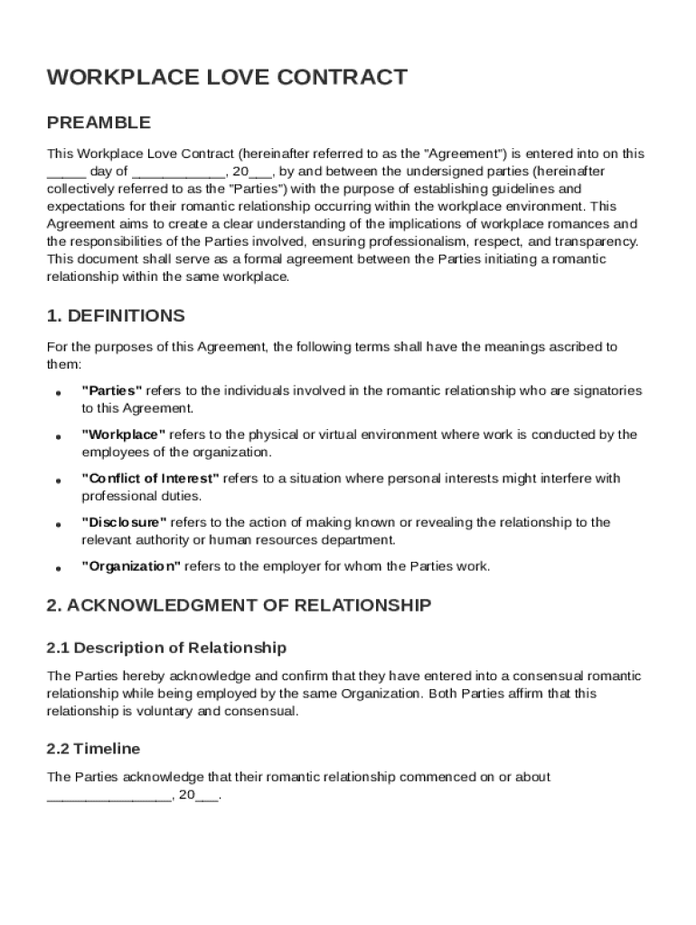 A Workplace Love Contract is a formal agreement outlining the terms and expectations associated with a romantic relationship between employees. By establishing guidelines for workplace romances, companies can minimize potential conflicts, protect employees, and maintain a professional atmosphere.
