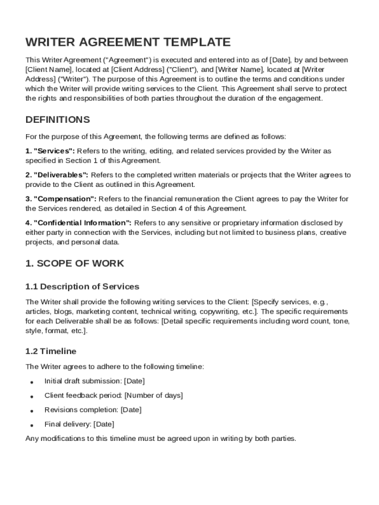 A comprehensive Writer Agreement Template should outline critical components to avoid ambiguity. These elements define the relationship and ensure that both parties have aligned expectations and roles.