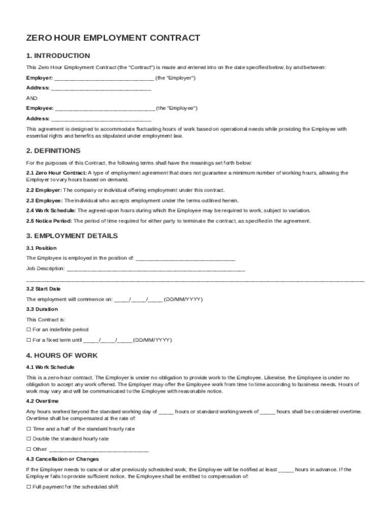 This document outlines the terms and conditions of a Zero Hour Employment Contract between an Employer and an Employee, including definitions, employment details, work hours, compensation, benefits,
