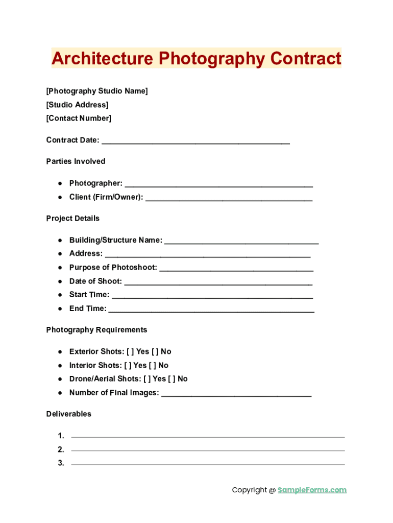 To further assist photographers in crafting a robust contract, providing a sample architecture photography contract can offer insights into best practices. This document can be broken down section by section, illustrating useful scenarios and applications that resonate with your specific audience.