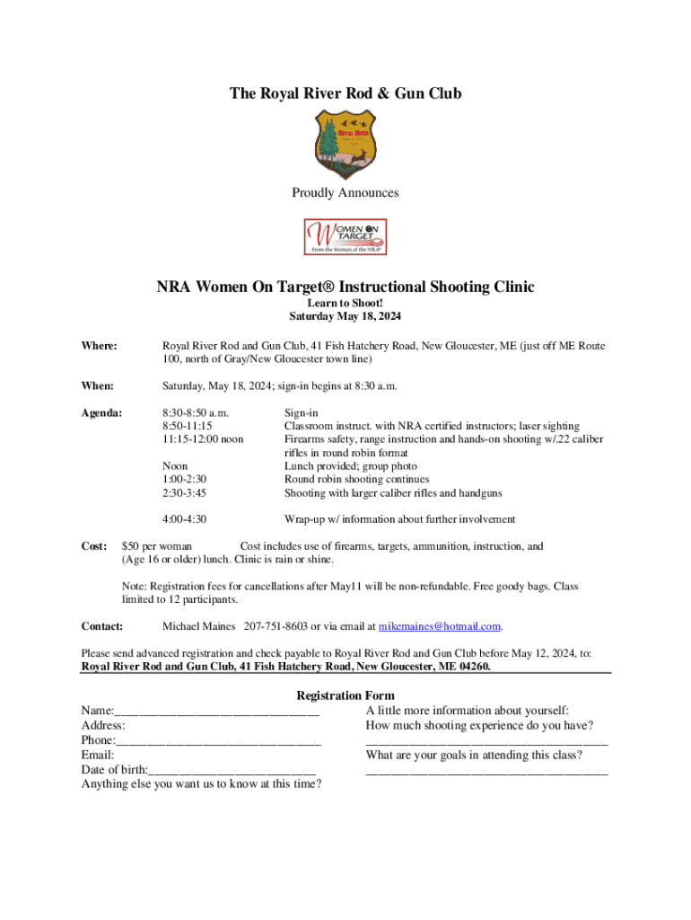 The form requires basic information, such as personal contact details, prior shooting experience, and any specific areas of focus participants wish to explore. Filling this form accurately is crucial, as it lays the foundation for a tailored experience in the clinics.