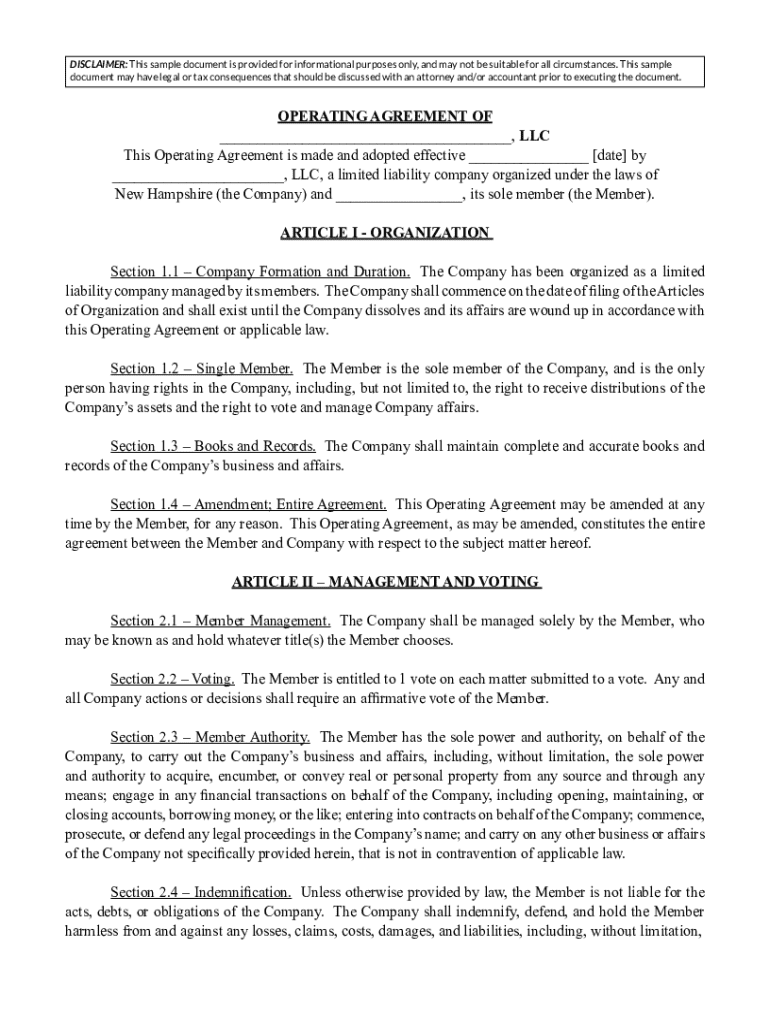 Get the free New Hampshire Single-member Llc Operating Agreement