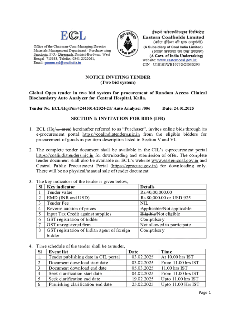 This document outlines the invitation to tender for procurement of clinical biochemistry auto analyzers for Eastern Coalfields Limited (ECL), detailing requirements, bidding process, and schedule.