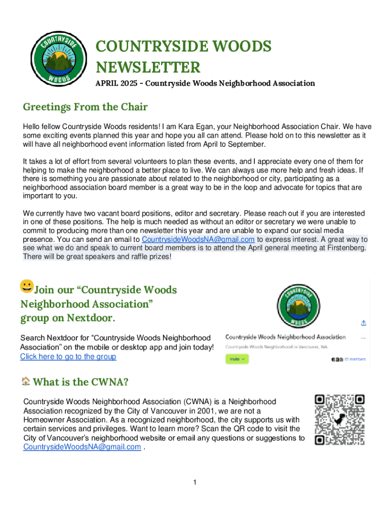 This newsletter serves to inform Countryside Woods residents about upcoming neighborhood events, volunteer opportunities, and updates from the Neighborhood Association.