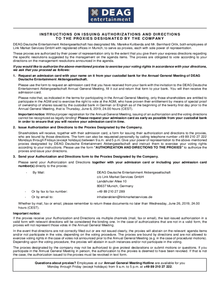 This document provides instructions for shareholders of DEAG Deutsche Entertainment Aktiengesellschaft on how to issue authorizations and voting directions to designated proxies for the Annual General