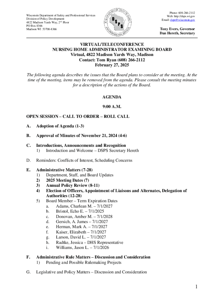 Get the free Nursing Home Administrator Examining Board Meeting Agenda - dsps wi