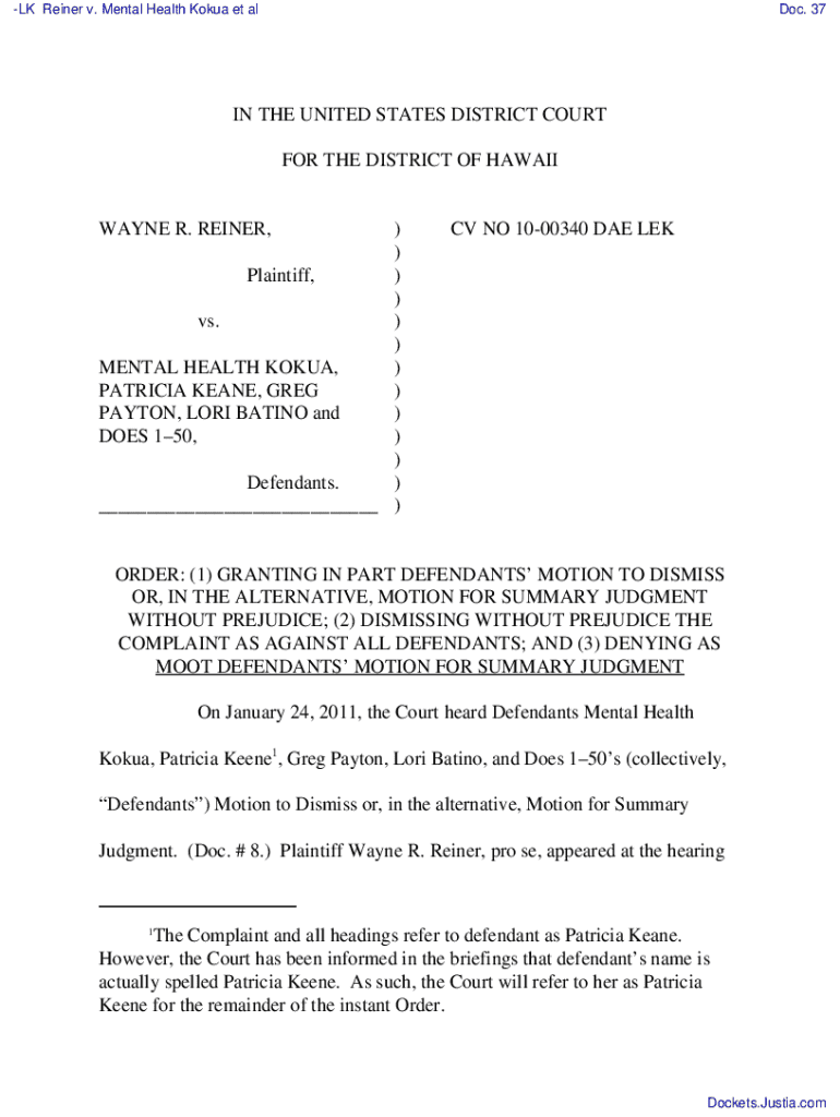 Get the free Reiner V. Mental Health Kokua Et Al