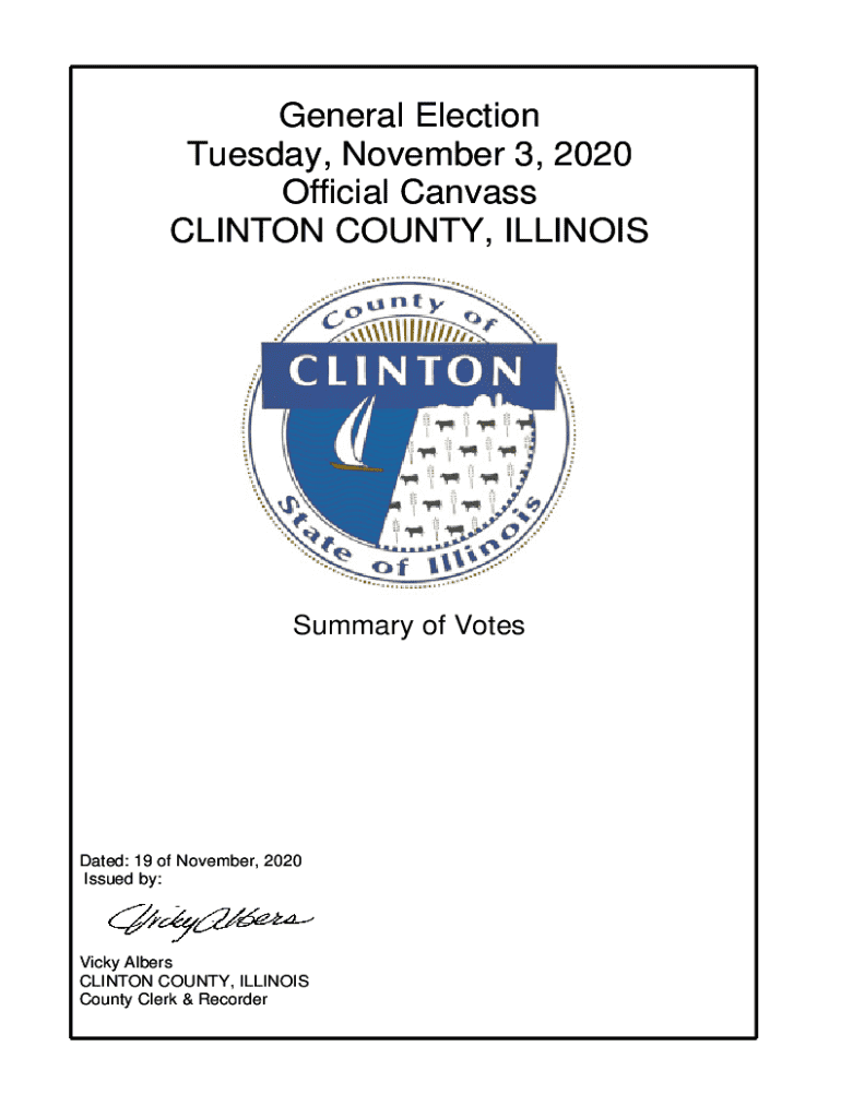 This document presents the official canvass of votes from the General Election held in Clinton County, Illinois on November 3, 2020. It provides detailed results by precinct for various offices and