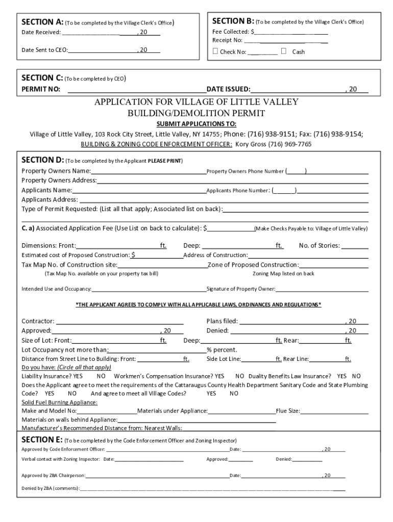 This document serves as an application for obtaining building or demolition permits within the Village of Little Valley. It includes sections for completion by various officials and the applicant,