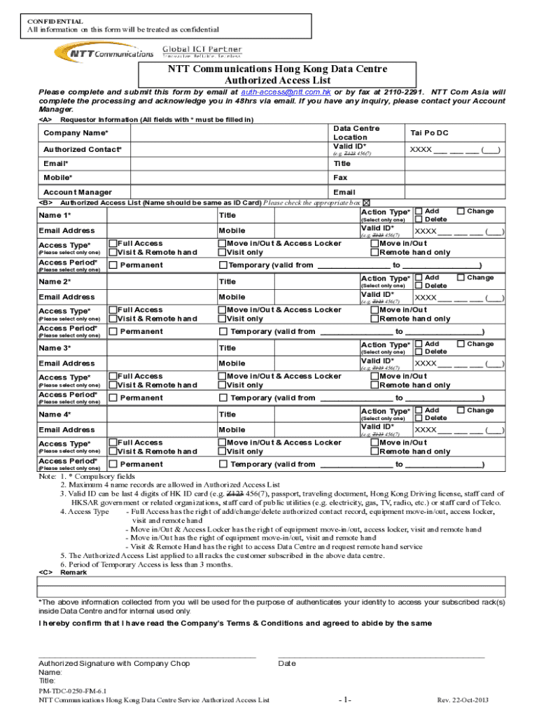 Get the free Ntt Communications Hong Kong Data Centre Authorized Access List
