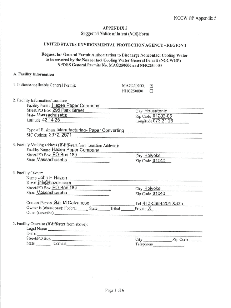 This document serves as a request for General Permit Authorization to discharge Noncontact Cooling Water under the Noncontact Cooling Water General Permit (NCCWGP). It includes detailed facility information,