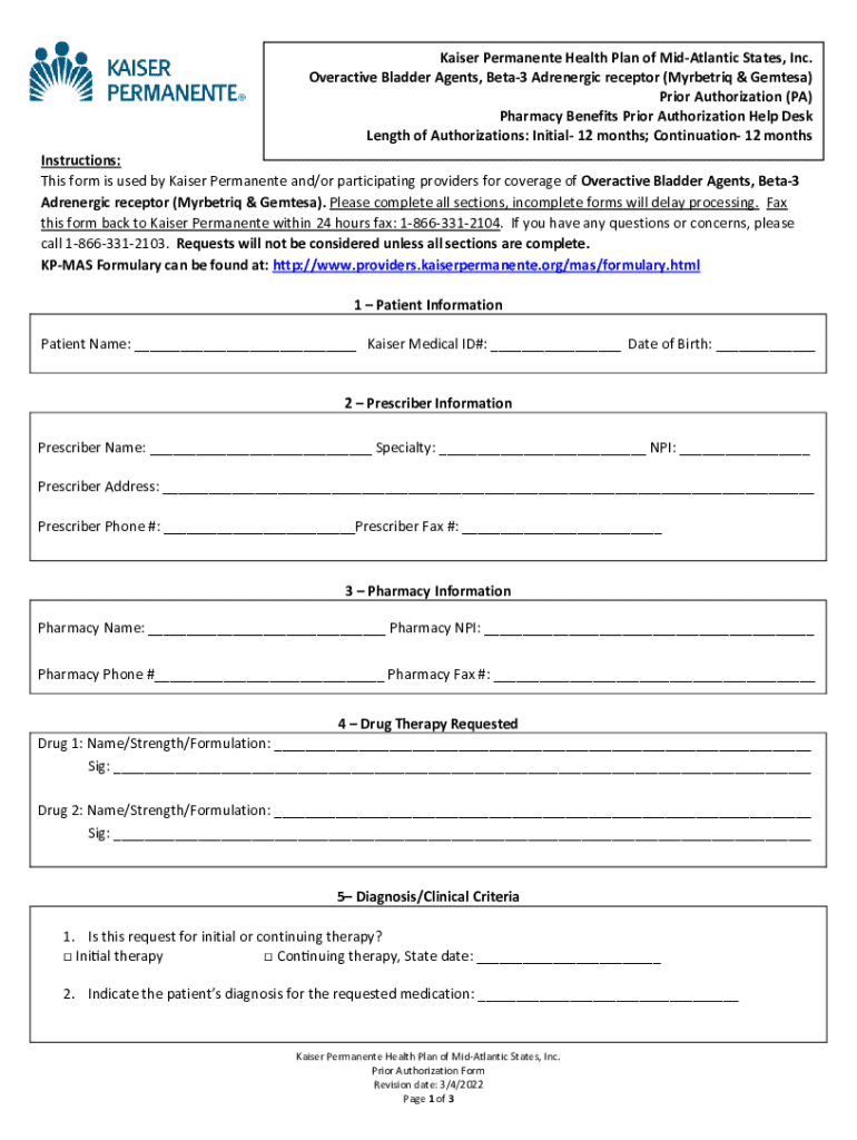 Get the free Kaiser Permanente Prior Authorization Form