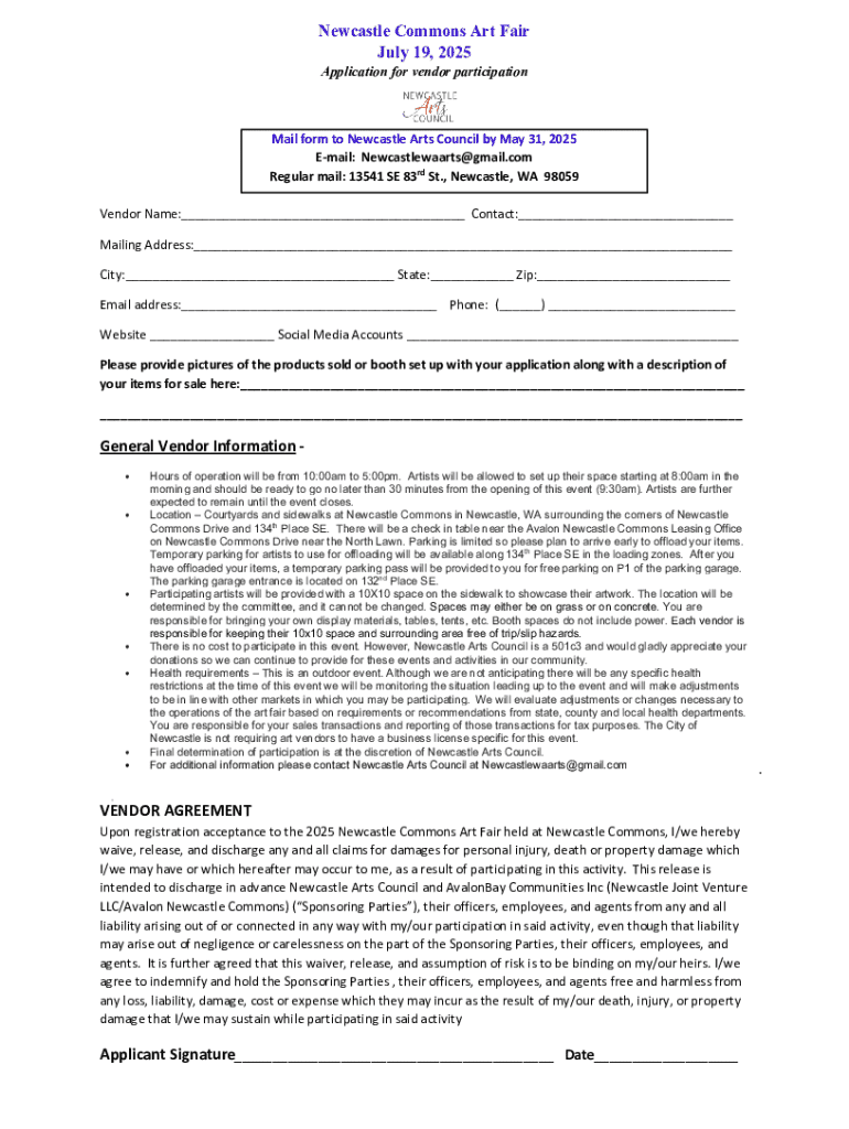 The Newcastle Commons Art Fair Form is a vital document for all artists and vendors wishing to participate in this vibrant art fair. This form streamlines the application process, ensuring that all necessary information is collected efficiently and accurately. Completing this form is crucial, as it allows organizers to curate a well-rounded selection of artworks and activities, enhancing the overall experience for attendees.
