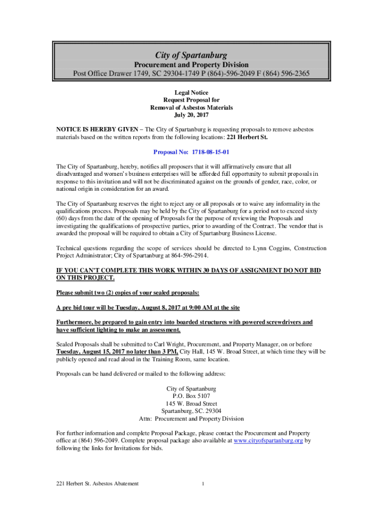 This document is a request for proposals from contractors for the removal of asbestos materials at a specified location in Spartanburg, SC. It outlines the proposal submission process, requirements