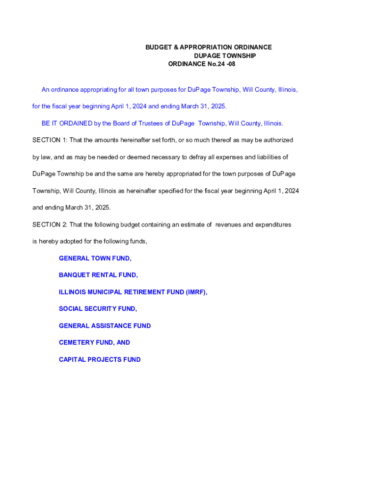An ordinance for appropriating town purposes for DuPage Township, detailing estimated revenues and expenditures for the fiscal year 20242025.