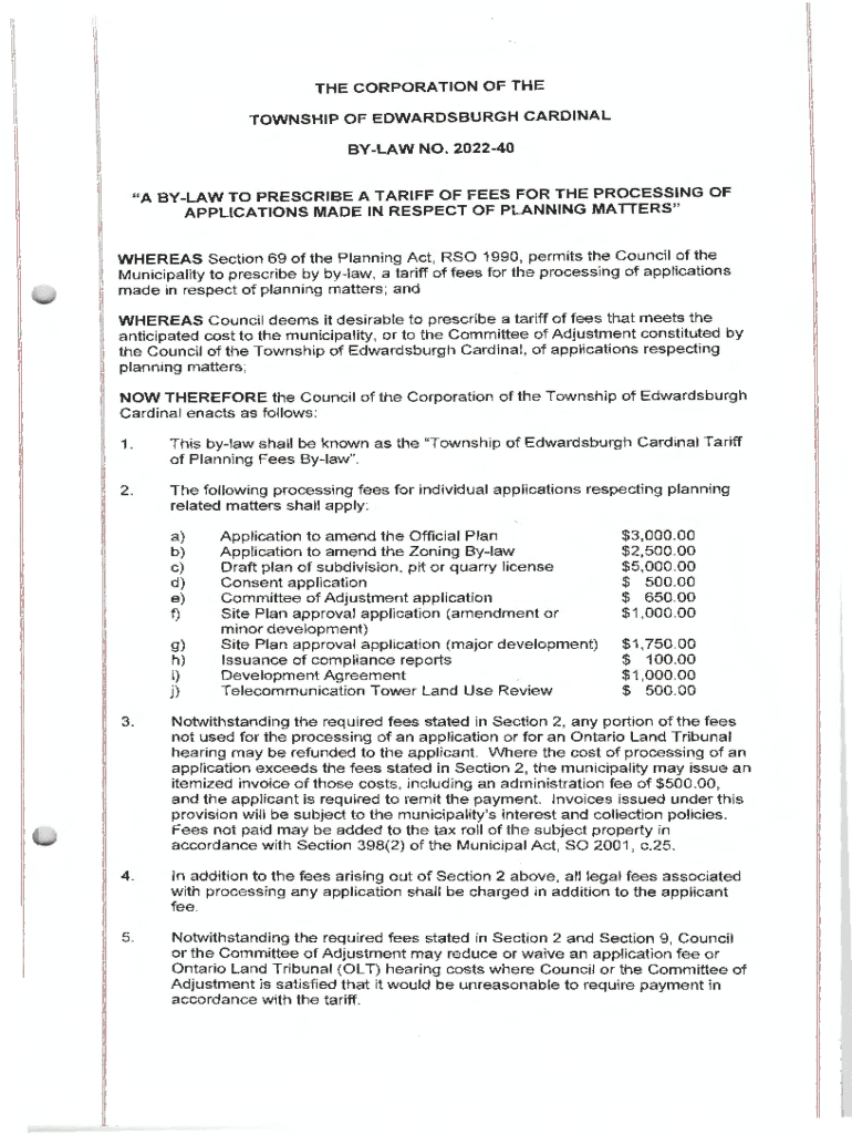 This bylaw prescribes a tariff of fees for processing applications related to planning matters in the Township of Edwardsburgh Cardinal, detailing the fees for various applications and the conditions