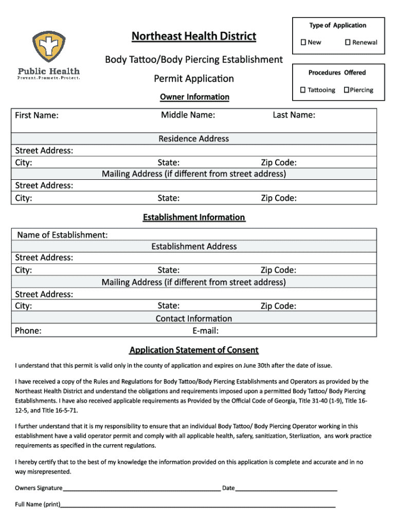 This document serves as a permit application for operating a body tattoo or body piercing establishment in the Northeast Health District, including sections for owner information, establishment details,