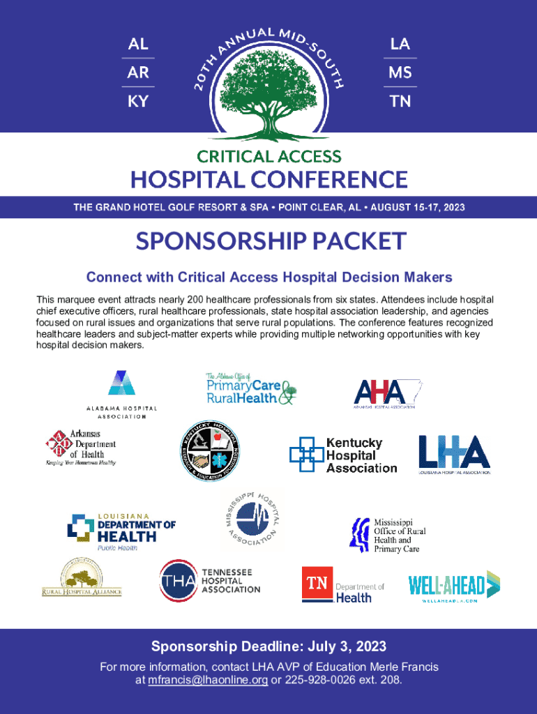 A sponsorship packet is a comprehensive document provided to potential sponsors outlining the details and benefits of sponsoring an event or initiative. It serves as both a pitch and informational resource that helps organizations secure funding or in-kind support from corporations and individuals.